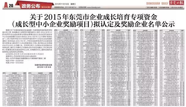 該公告已在東莞市經(jīng)信局官方網(wǎng)站及東莞日?qǐng)?bào)上(2015年11月18日)公示。