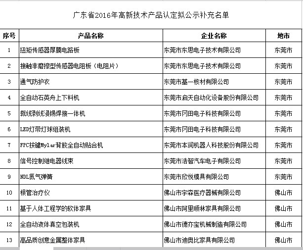 關(guān)于廣東省2016年高新技術(shù)產(chǎn)品認(rèn)定擬公示補(bǔ)充名單的通知